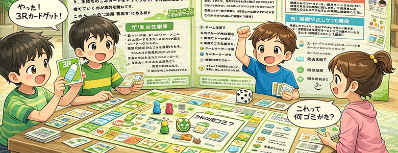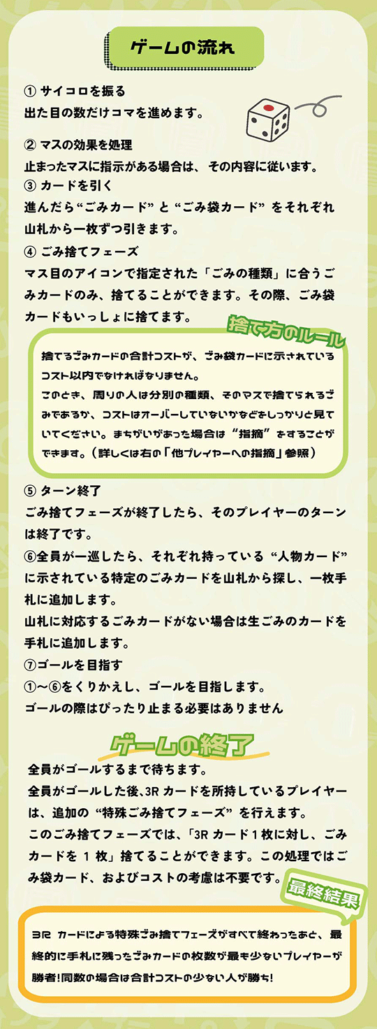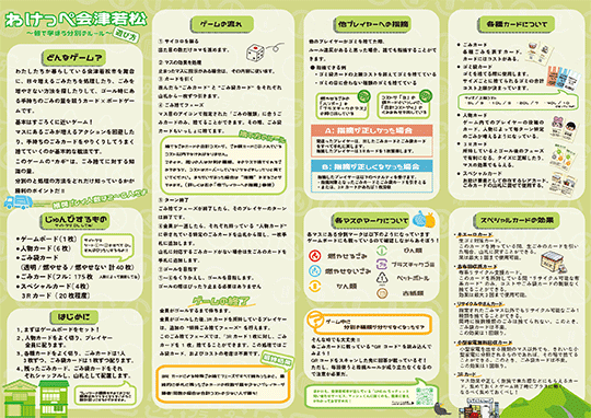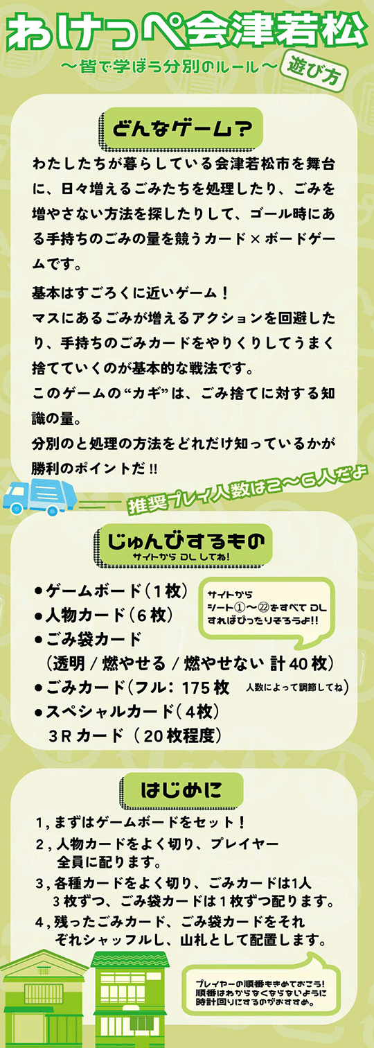 遊びながら会津若松市のごみ捨てルールを学ぶ(詳しくなる)主旨ですが、すごろくのようなボードを使い、プレイヤーや各種カードを活用しながらゴールを目指します。